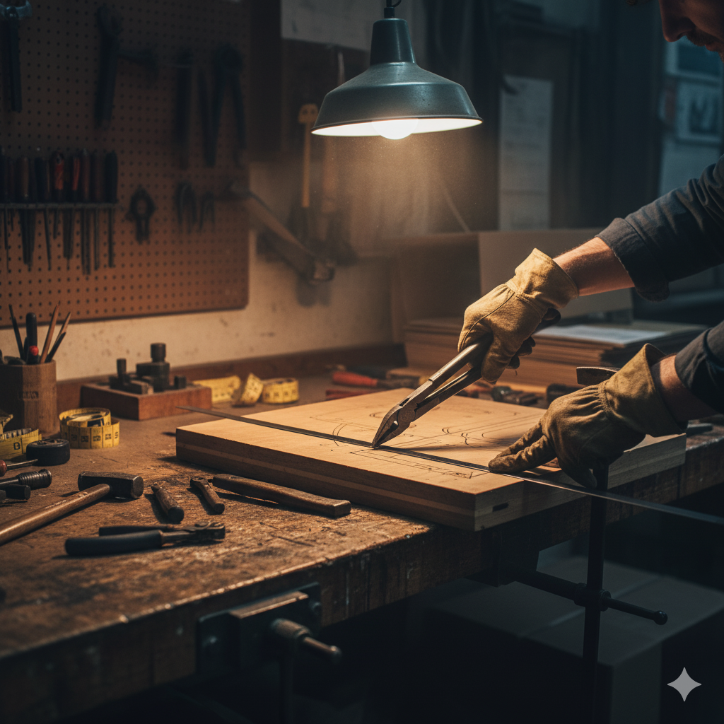 - برش دستی تخته: طرح نهایی روی تخته چوبی منتقل شده و مسیرهای تیغه با ارههای دستی یا مکانیکی ساده برش داده میشوند.