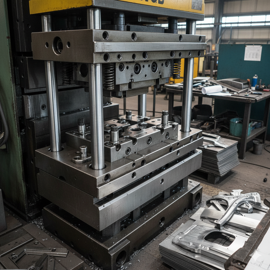 | قالب پروگرسیو (Progressive Die) | انجام چندین عملیات (برش، خم، سوراخکاری) به صورت متوالی در یک قالب، بدون نیاز به انتقال دستی قطعه. | حرکت خطی ورق از ایستگاههای متوالی. |